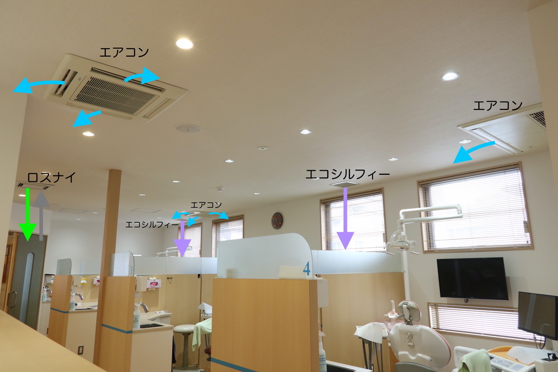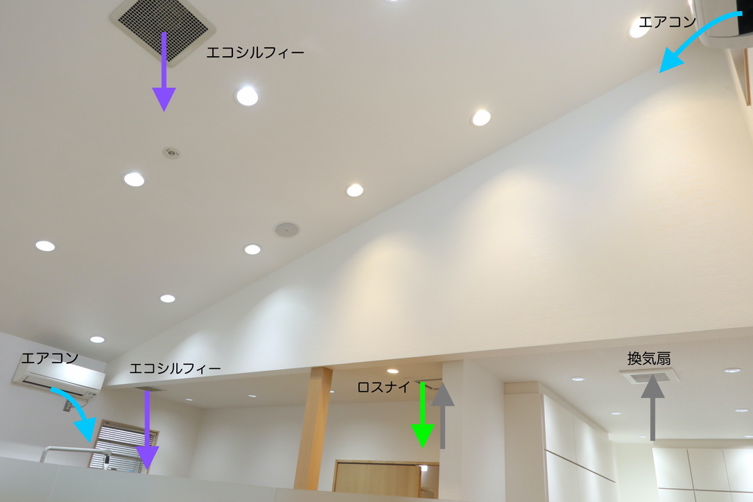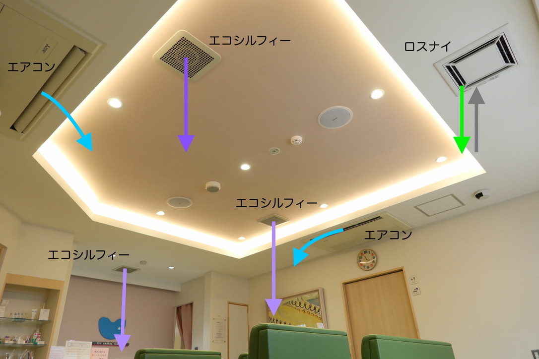 このように、ゆう歯科クリニックの空調システムは、診療室と待合室だけでもロスナイ3基、エコシルフィー7基、換気扇3基、エアコン7基が設置されています。