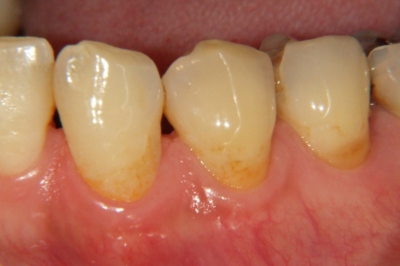 一方、歯ぎしりやくいしばりの力が、歯槽骨に及ぶと、歯と歯槽骨をつないでいる歯根膜に炎症が起こり、歯槽骨の吸収を促進させ、歯頚部の歯ぐきが退縮します。