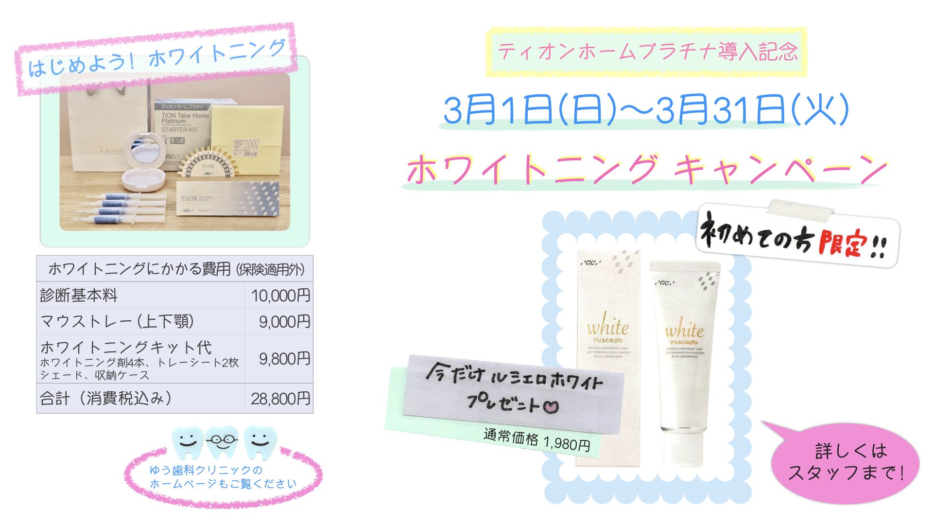 3/1(日)〜3/31(火)の期間中にホワイトニングをスタートされるかた限定で、歯磨剤ルシェロホワイト(通常価格1,980円)を1本プレゼント!!
