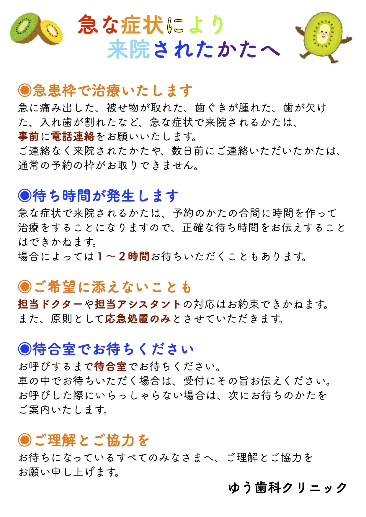 急に痛み出した、被せ物が取れた、歯ぐきが腫れた、歯が欠けた、入れ歯が割れたなど、急な症状で来院されるかたは、事前に電話連絡をお願いいたします。