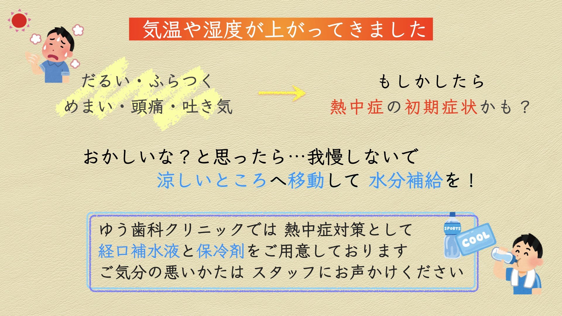 ゆう歯科クリニックでは熱中症対策として、経口補水液や保冷剤をご用意しておりますので、ご気分の悪いかたは、遠慮なさらずスタッフにお声かけください。