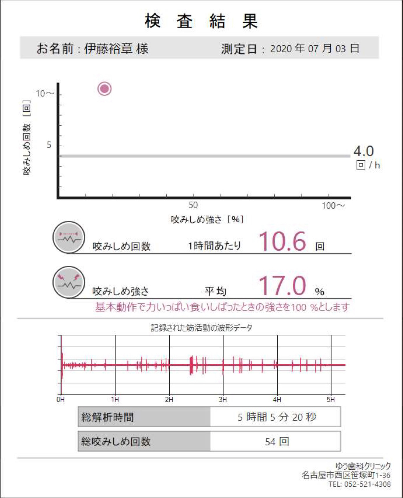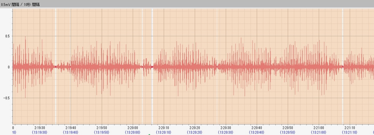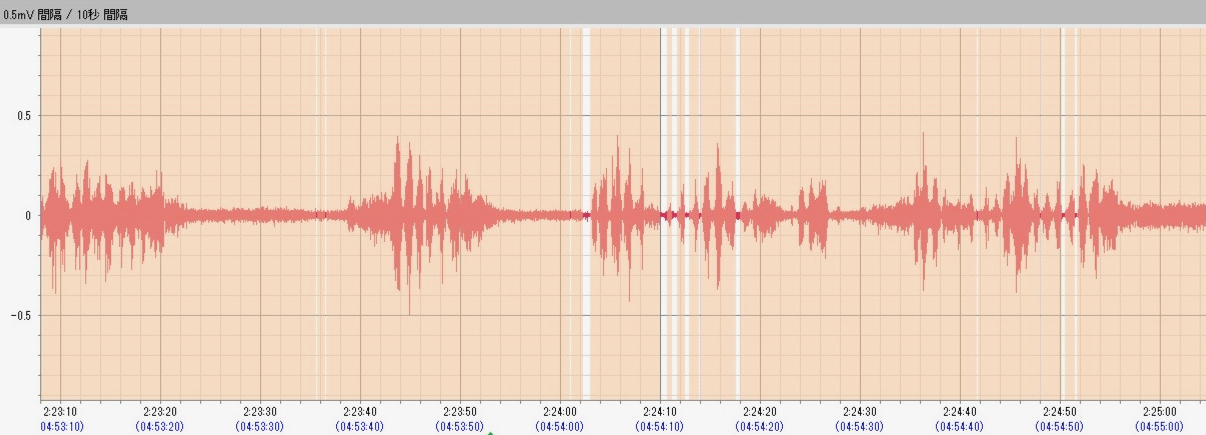 私自身、自覚症状もあり「歯ぎしりをしているだろう」と予想はしていたのですが、結果は1時間あたり10.6回。