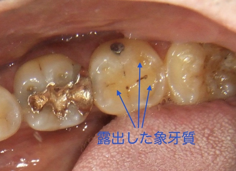 私の大臼歯も、すり減りで内部の象牙質が露出してしまっています。