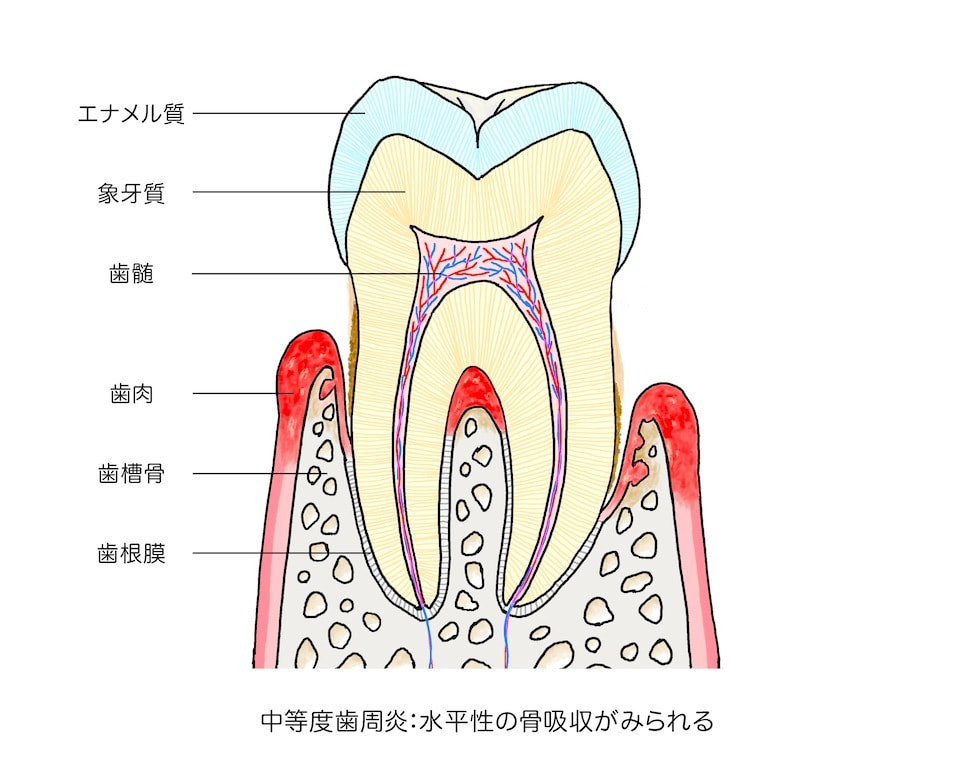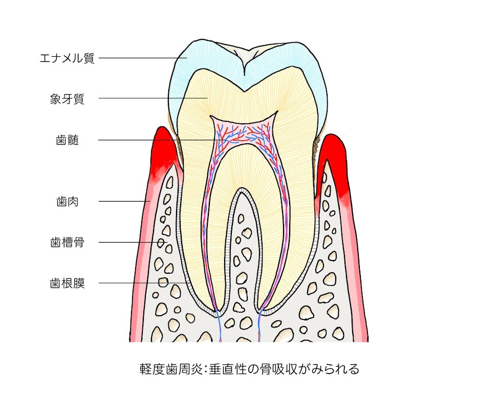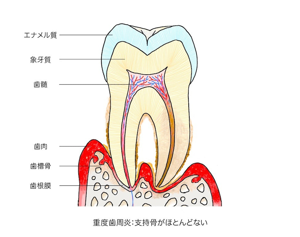 歯周病とは、歯ぐきに細菌が侵入して、炎症を起こしたり、歯槽骨(しそうこつ、歯を支える骨)が崩壊していく病気です。